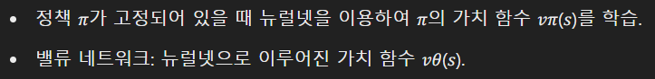 - 밸류 네트워크(Value Network)는 뉴럴넷으로 가치 함수 (v_\pi(s))나 (q_\pi(s, a))를 표현하는 방식이다.