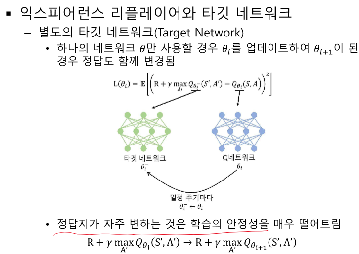 - 하나의 네트워크만 사용할 경우 정답이 자주 변하여 학습 안정성이 떨어짐.