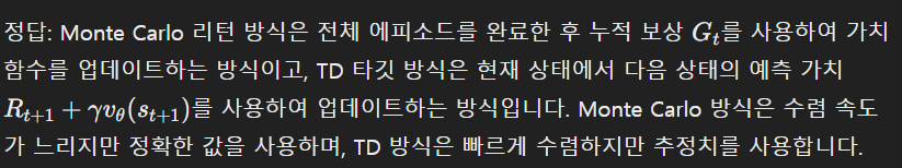 - 해설: Monte Carlo 리턴과 TD 타깃 방식은 업데이트 시 사용하는 값에서 차이가 있으며, 각각의 장단점이 있습니다.