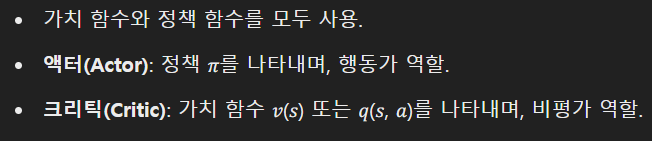 액터 크리틱 : 가치 함수와 정책 함수를 모두 사용한다.