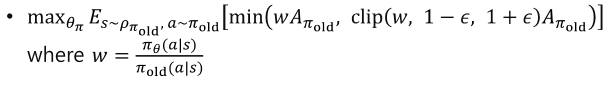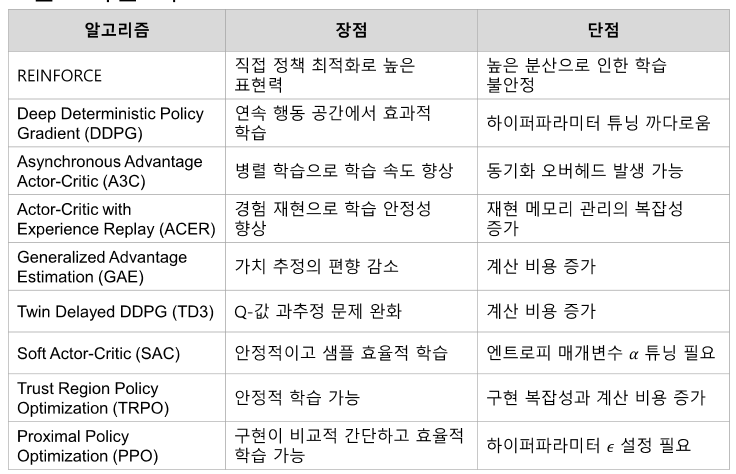- PPO: 구현이 비교적 간단하고 효율적 학습 가능, 하이퍼파라미터 𝜖 설정 필요