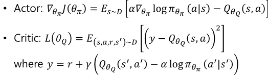 - SAC: 안정적이고 샘플 효율적 학습, 엔트로피 매개변수 𝛼 튜닝 필요