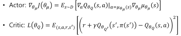 - DDPG: 연속 행동 공간에서 효과적 학습, 하이퍼파라미터 튜닝 까다로움
