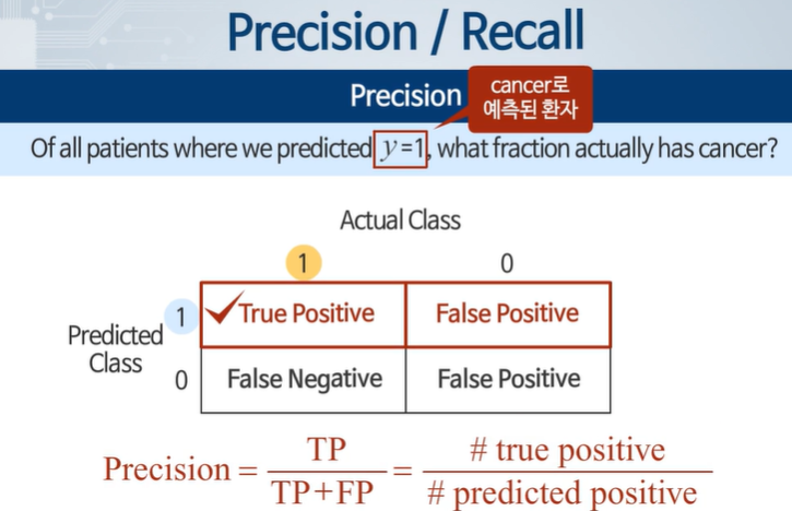 Postive로 예측한 사람들 중에서 실제 cancer 환자가 얼마나 되는가?