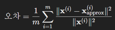 - 원래 데이터 (\mathbf{x}^{(i)})와 근사 데이터 (\mathbf{x}_{\text{approx}}^{(i)}) 간의 오차를 계산합니다.