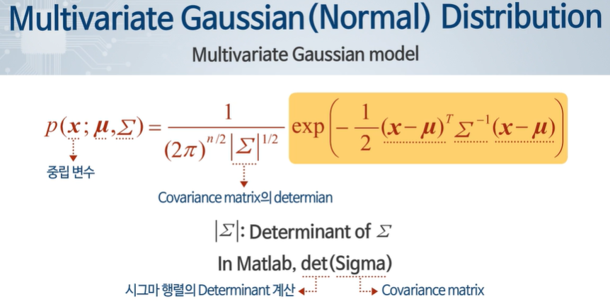 이상 데이터가 기울어진 분포를 확인했을 때 이상데이터임을 확인할 수 있는 경우가 있으므로 다변수 가우시안을 잘 확인해야 한다. - Multivariate Guassian distribution