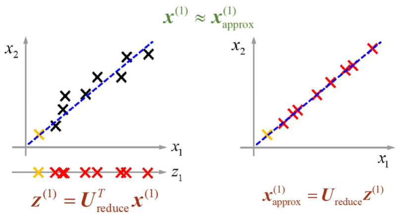 - 이를 통해 ( \mathbf{U}{\text{reduce}}, \mathbf{z}^{(1)}, \ldots, \mathbf{z}^{(k)}, \mathbf{x}{\text{approx}}^{(1)}, \ldots, \mathbf{x}_{\text{approx}}^{(m)} ) 값을 구합니다.