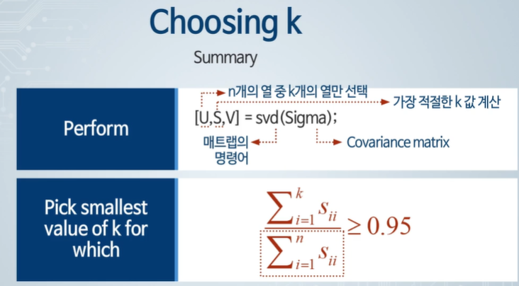 PCA에서 ( k ) 값을 구하는 방법에는 여러 가지 접근 방식이 있으며, 이미지에서 설명하는 방식도 유효한 방법 중 하나입니다. 이를 단계별로 설명하겠습니다.