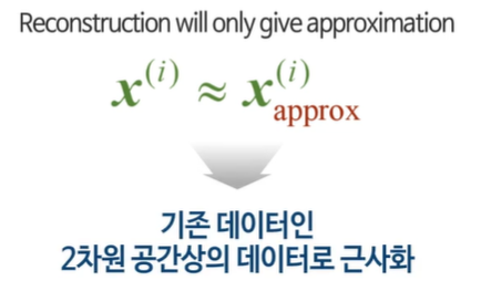 - 이 투영된 값을 다시 원래의 고차원 공간으로 변환하여 근사값 ( \mathbf{x}_{\text{approx}} )를 계산합니다.