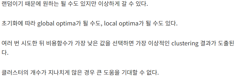 - K-means는 다른 국소 최적 값에서 멈출 수 있다