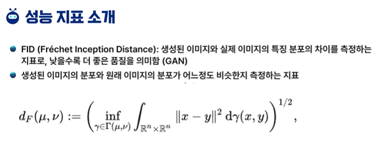 FID : 분포의 차이 측정, 낮을 수록 더 좋다.