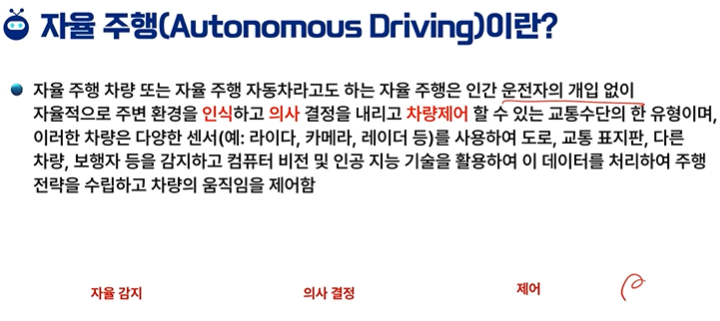 - 주변 환경 감지와 의사 결정은 자율 주행의 핵심 기능을 정확하게 설명합니다. 자율 주행 차량은 다양한 센서를 사용하여 주변 환경을 인지하고, 이를 바탕으로 주행 경로를 포함한 여러 가지 의사 결정을 내립니다.