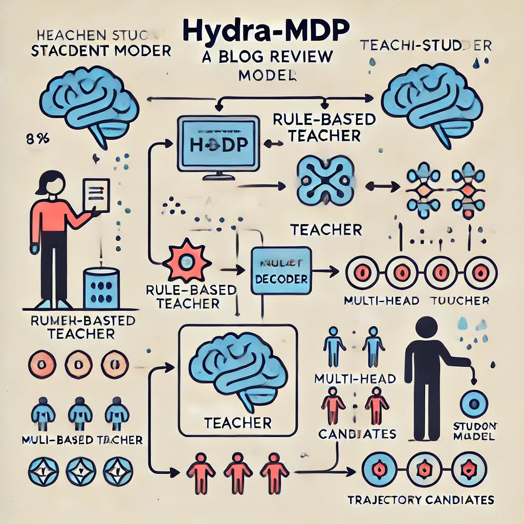 Hydra-MDP는 자율 주행을 위한 엔드 투 엔드 계획 시스템으로, 여러 교사(즉, 인간 교사와 규칙 기반 교사)로부터 지식을 배우는 학생 모델을 사용합니다. 이 접근법의 핵심 개념과 작동 방식을 자세히 설명하겠습니다.