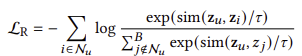 사용자 z𝑢와 항목 z𝑖 임베딩을 활용하여, 우리는 모델이 선호하는 항목에는 더 높은 점수를, 선호하지 않는 항목에는 더 낮은 점수를 부여하도록 훈련시킵니다. 우리는 표현 학습에서 널리 사용되는 대조 손실 [20, 34]을 사용합니다. 구체적으로, 각 사용자에 대해 선호하는 항목은 긍정으로 식별되고, 반대로 미니배치의 다른 모든 항목은 부정으로 간주됩니다. 모델은 긍정 쌍을 최대화하고 부정 쌍을 최소화하도록 최적화됩니다. 각 미니배치에 대한 평점 순위 손실 LR은 다음과 같이 정의됩니다: