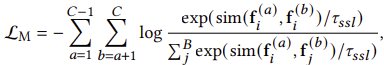 여기서 sim(⋅)은 두 벡터 표현의 유사성을 내적을 사용하여 계산하며, τssl은 온도 하이퍼파라미터를 나타내며, B는 배치 내의 예제 수를 나타냅니다.