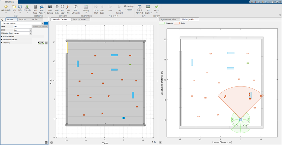 packEgo가 계산된 값을 버스로 묶어서 Scenario Reader에 보내주고, 그 값을 통해 라이다와 초음파 센서 값들이 변동되게 됩니다.
