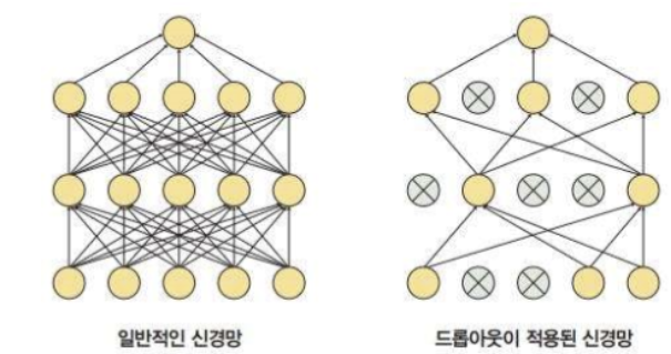 Drop out도 오버피팅을 방지하기 위한 방법으로, 레이어에서 모든 노드를 사용하는 것이 아닌 일정 부분을 확률상으로 사용하지 않아 학습에서 제외시켜 과적합을 피한다.