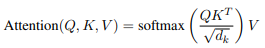 여기서 , , V는 Query, Key, Value 매트릭스를 의미하고, dk는 key의 차원입니다.