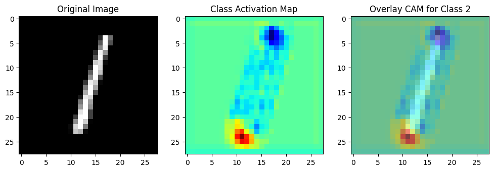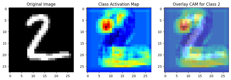 cam = (features[i] @ gap_weights[:, np.argmax(results[i])]).reshape((28, 28))# 실제 CAM을 계산합니다. 이는 각 특성 맵에 대한 가중치(해당 이미지가 속한다고 예측된 클래스에 대한)와 특성 맵을 곱한 것의 합으로, 이미지의 중요한 영역을 강조합니다.