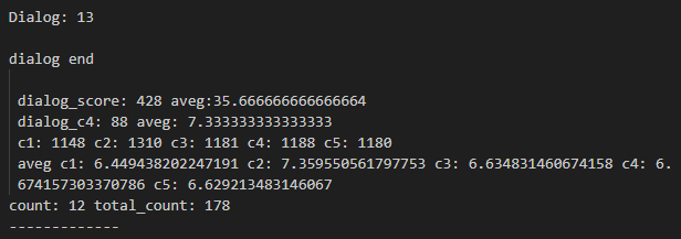f.write(f"dialog end \n\n dialog_score: {dialog_score} aveg:{dialog_score/count}\n dialog_c4: {dialog_c4} aveg: {dialog_c4/count}\n c1: {c1} c2: {c2} c3: {c3} c4: {c4} c5: {c5}\n aveg c1: {c1/total_count} c2: {c2/total_count} c3: {c3/total_count} c4: {c4/total_count} c5: {c5/total_count}\ncount: {count} total_count: {total_count}\n-------------\n\n")