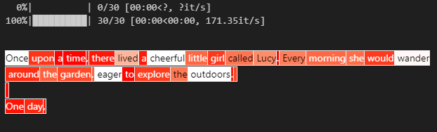 model.generate와 토큰 로그 확률 시각화를 결합하여 모델이 생성한 텍스트에서 로그 확률을 확인해 봅시다. 여기서 온도를 조절하면 모델이 덜 가능성 있는 경로를 샘플링하게 할 수 있다는 점을 유의하세요. 저는 전체 이야기를 얻기 위해 최대 토큰 수를 늘렸습니다.