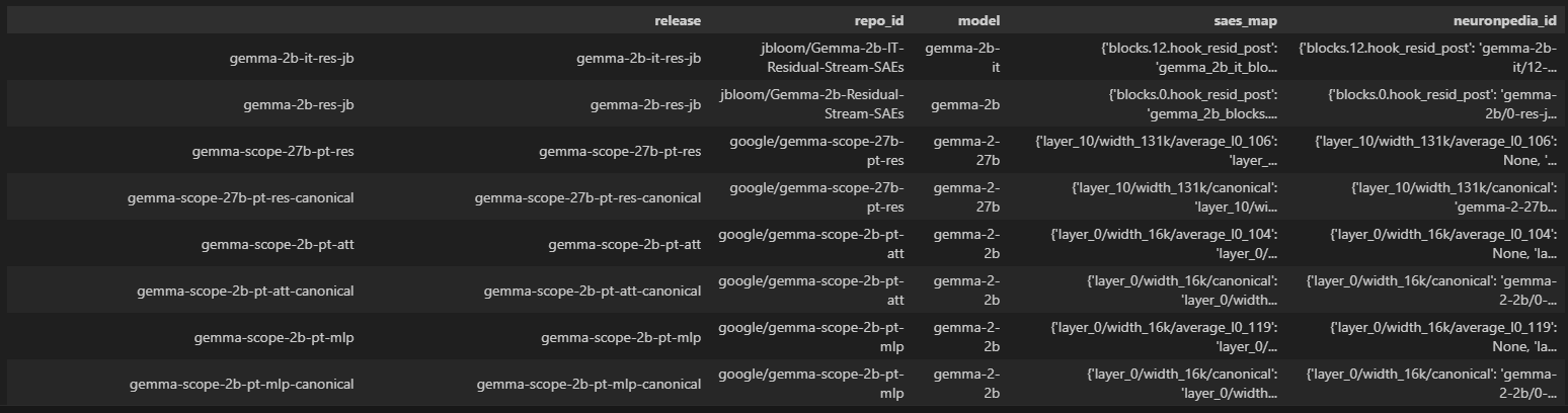 df # Each row is a "release" which has multiple SAEs which may have different configs / match different hook points in a model.