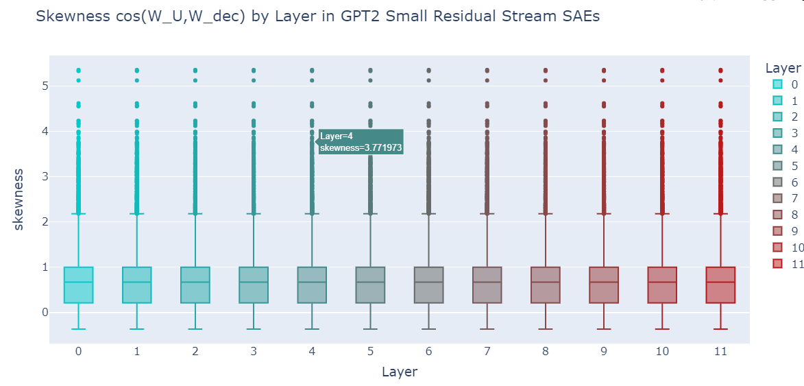 title="Skewness cos(W_U,W_dec) by Layer in GPT2 Small Residual Stream SAEs",