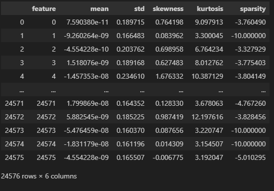 - 예를 들어, feature 0은 첫 번째 뉴런에 대한 통계값을 나타내고, feature 24575는 마지막 뉴런에 대한 통계값입니다.