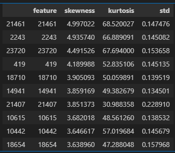 - 예를 들어, feature 4의 왜도는 1.676332로 양수이므로, 해당 특징 벡터의 값이 크게 활성화되는 경우가 많다는 것을 의미합니다.