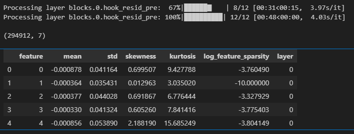 - 예를 들어, feature 0의 평균은 7.59e-11로 거의 0에 가깝기 때문에, 이 뉴런의 활성화 값은 매우 균형 잡혀 있다고 볼 수 있습니다.