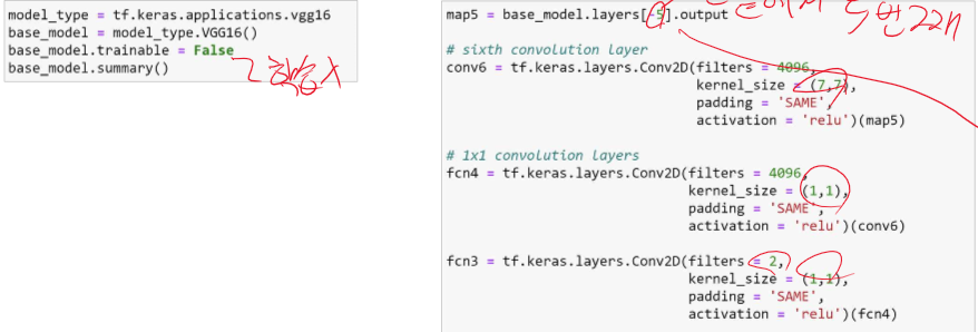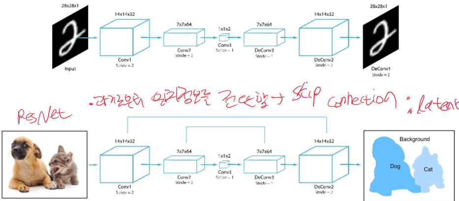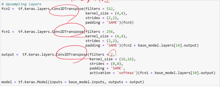 여기선 DENSE layer를 사용하지 않고, convolution을 통한 down sampling, up sampling을 사용한다. 그리고 결과는 클래스 개수 만큼 채널이 나오고 원 핫 인코딩 된다.