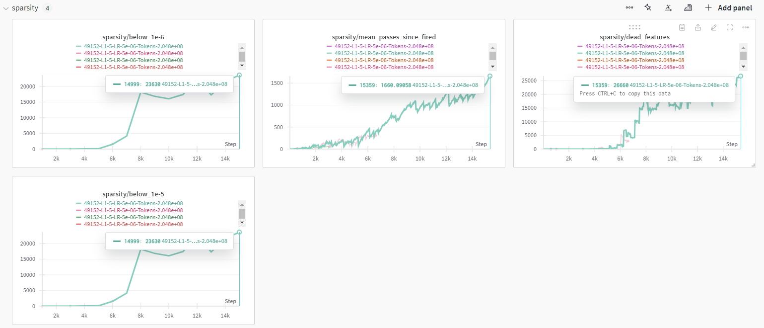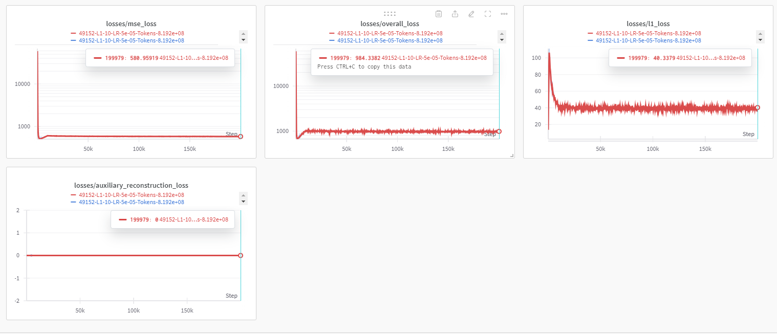 일단 여기서 부터는 1024 context length에 latent space는 16 * 3072 , l1 coefficent = 5 입니다.