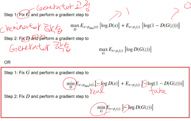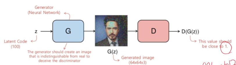 판별자는 1(진짜 데이터), 0(생성형 데이터)로 구분하려고 학습한다. 그리고 데이터는 진짜 데이터와 생성형 데이터를 섞어서 보내준다. 생성형 인공지능은 1(진짜 데이터)로 판별하도록 계속 학습한다.