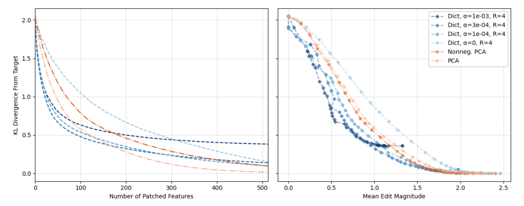 - 피처 분해 정확도 향상: indirect object identification task(간접 목적어 식별 작업)에서 sparse autoencoder로 학습된 피처들이 다른 분해 방법보다 더 세밀하게 신경망의 특정 행동을 유발하는 피처를 식별할 수 있음을 확인했습니다.