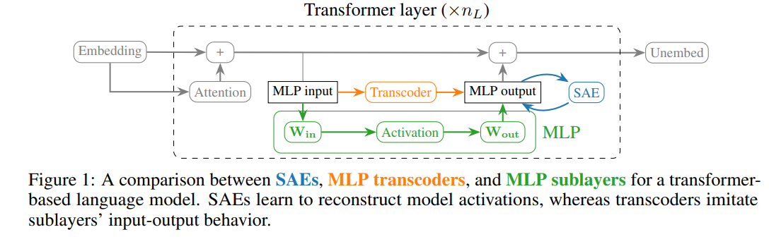 그래서 기존 MLP연산 직전의 입력과 MLP 연산 후의 출력을 따라잡는 Sparse Autoencoder인 Transcoder를 제작하여 SAE보다 단일적이며, 특징도 더 잘 설명한다고 주장.