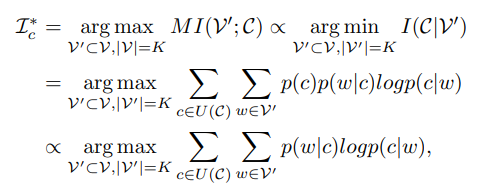 - 어휘 집합 선택: 고정된 어휘 집합 V에서 각 특징 벡터 Wc가 설명할 수 있는 최적의 단어 집합 Ic를 찾습니다. 이 단어 집합은 상호 정보량 I(C;V′)을 최대화하는 단어들로 구성됩니다.