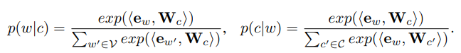 - 단어 임베딩 사용: 각 단어와 특징 벡터 간의 연관성을 계산하기 위해 단어 임베딩을 사용합니다. 구체적으로, 단어 임베딩 ew와 특징 벡터 Wc 간의 내적을 통해 두 벡터의 유사성을 측정하여 p(w∣c)와 p(c∣w)를 계산합니다.