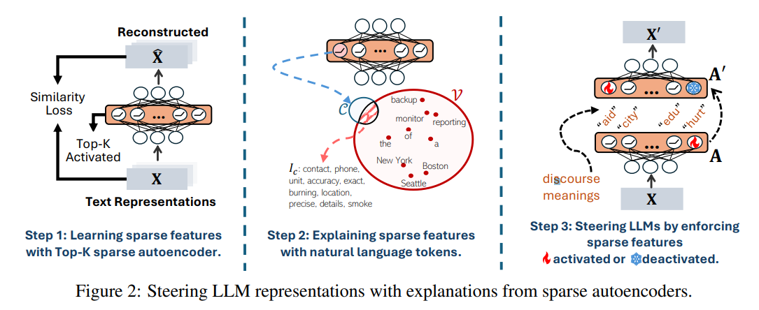 먼저 Sparse Autoencoder를 이용하여 LLM의 숨겨진 공간에서 특징 벡터를 학습합니다. Sparse Autoencoder는 LLM이 각 입력 텍스트에 대해 희소한 (sparse) 특징을 활성화하도록 학습됩니다. 즉, 텍스트 데이터의 중요한 요소들을 추출해내는 역할을 하며, 이 과정에서 각 특징 벡터가 특정 단어, 주제, 혹은 개념과 관련된 정보를 내포하게 됩니다.