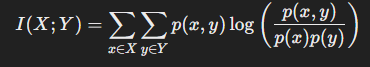 상호 정보량(MI)은 두 변수가 서로 얼마나 의존하는지를 나타내는 척도입니다. 즉, 하나의 변수(여기서는 특징 벡터)가 다른 변수(여기서는 단어)의 정보를 얼마나 잘 설명할 수 있는지를 수량화하는 것입니다.