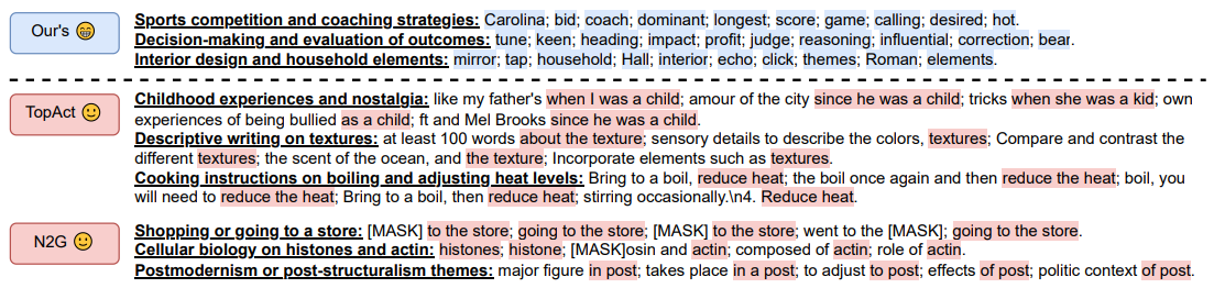 - 상호 정보량 기반 설명 기법: 학습된 특징이 언어적 패턴보다 더 의미 있는 담론 수준의 주제를 설명할 수 있도록 상호 정보량을 사용해 특징을 설명했습니다. 구체적으로는, 고정된 어휘 집합을 기반으로 학습된 특징과 어휘 간의 상호 정보를 극대화하여 특징의 의미를 도출했습니다.
