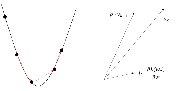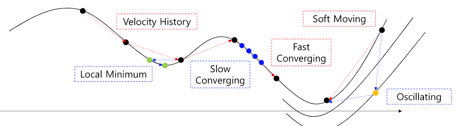 이 optimizer는 느린 학습, local minimum에 빠지는 것, 진동을 해결했다. Momentum은 속도의 역사(과거의 gradient를 기록하여 현재에 반)에 의해 계산된다.