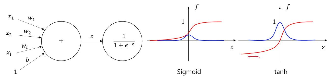 vanishing gradient의 원인인 sigmoid와 tanh의 미분 브래프 이다. sigmoid는 미분하면 최대가 0.3이고, tanh는 1이고, 둘 다 양끝은 0이기 때문에 반복하다 보면 기울기 소실이 발생하는 것이다.