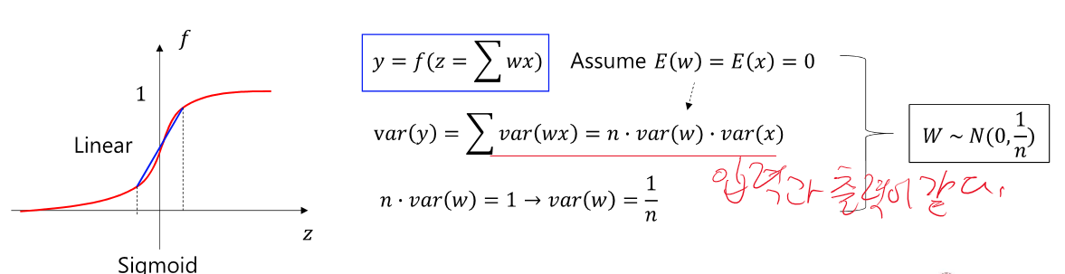 초기에 너무 큰 값을 weight에 주게 되면 ReLU나 Leaky ReLU에선 Exploding gradient가 발생하고, sigmoid나 tanh에서는 vanishing gradient가 발생한다.