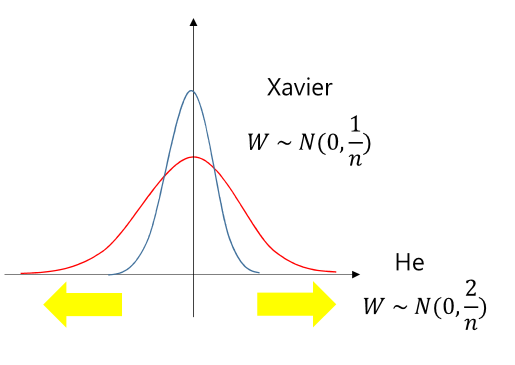 He는 Xavier와는 다르게 ReLU도 사용할 수 있다. He는 분산의 두배를 사용하여 음수 입력을 인한 정보 손실을 보안하기 위함이다. 즉 Xavier는 절반이 사라지면서 분산에 대한 정보가 많이 사라지지만 He는 절반이 사라지더라도 분산에 대한 정보가 많이 남아있게 된다.