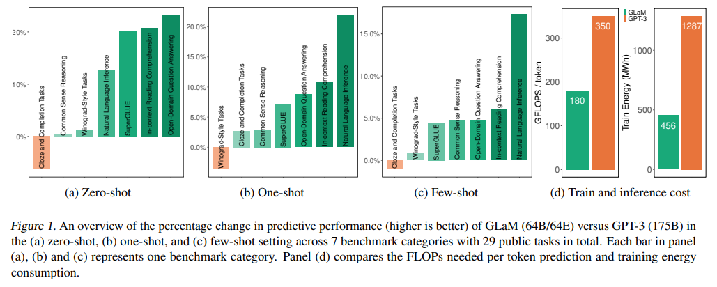 GLaM은 총 29개의 NLP 과제에서 테스트되었으며, 결과적으로 GPT-3보다 높은 평균 성능을 기록했습니다. 특히, zero-shot, one-shot, few-shot 설정 모두에서 GPT-3를 능가하는 성과를 보였으며, 다음과 같은 주요 성과를 달성했습니다: