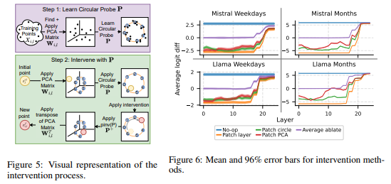 이 과정을 통해 GPT-2와 Mistral 7B에서 요일 및 달을 나타내는 원형 순환(circular) 특성을 발견했습니다. 즉, 특정 다차원적 특징이 단순 선형적 관계로 설명되지 않고 순환적 또는 공간적으로 배치되는 다차원 구조를 형성하는 것을 확인한 것입니다.