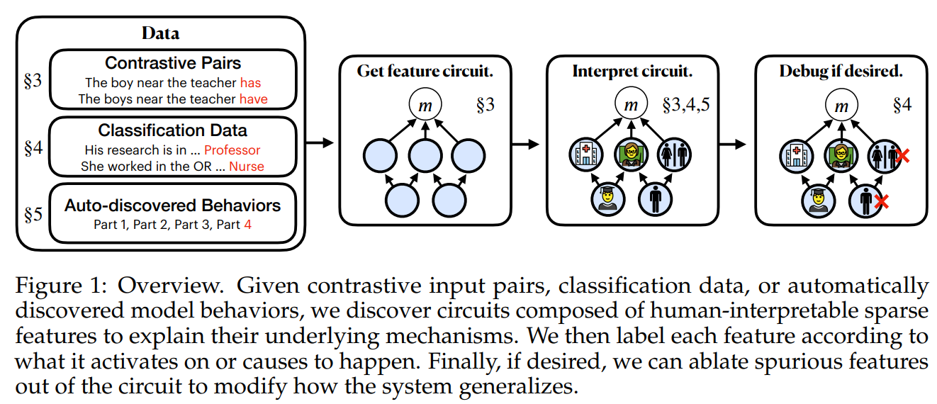 언어 모델의 예상치 못한 행동을 인간이 이해할 수 있게 설명하는 것은 해석 가능성 연구의 핵심 문제입니다. 기존에는 신경망의 다양한 구성 요소(예: 뉴런, 어텐션 헤드 등)를 분석해 모델 행동을 설명하려고 했으나, 이러한 접근법은 여러 의미(polysemantic)를 가질 수 있어 해석이 어렵습니다. 따라서, 이 논문은 세분화된 해석 가능한 구성 요소를 기반으로 스파스 특징 회로를 통해 예상하지 못한 모델 메커니즘을 밝혀내고, 이를 다운스트림 과제에 적용하는 것을 목표로 합니다.