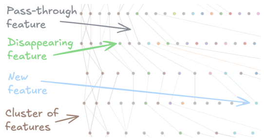 모든 Layer에 SAE를 장착하고, 그 SAE를 분석하여 Feature가 다음 레이어에 그대로 전달되거나, 합쳐지고, 사라지기도 하면서 정보가 전달되는 것을 볼 수 있습니다.