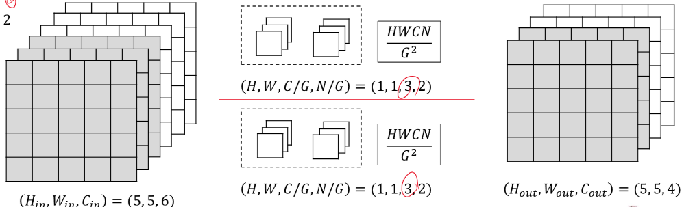 group Convolution은 input을 group 개수대로 잘라서 각각 필터를 적용하여 뒤에서 합치는 것이다. 파라미터의 개수가 (1,1,6,4)일 때 보다 반이 줄어드는 이점이 있다.