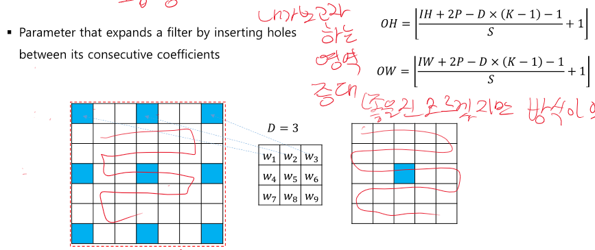 필터의 크기가 커질수록 receptive field가 커지지만 파라미터의 수가 증가한다.